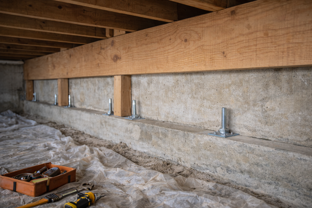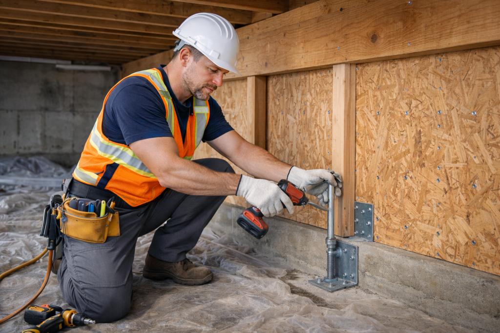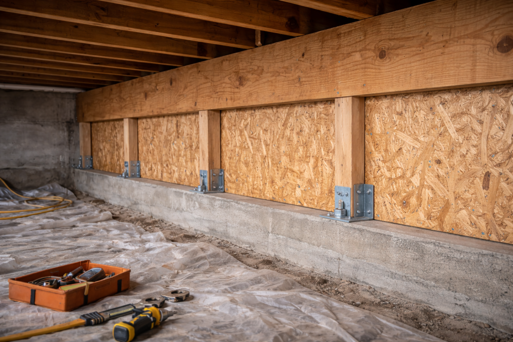 • Structural Bracing: We install heavy-duty plywood or OSB (Oriented Strand Board) sheathing along the interior of the cripple walls. This creates a rigid “shear wall” effect that effectively resists the lateral (side-to-side) forces generated by seismic activity.